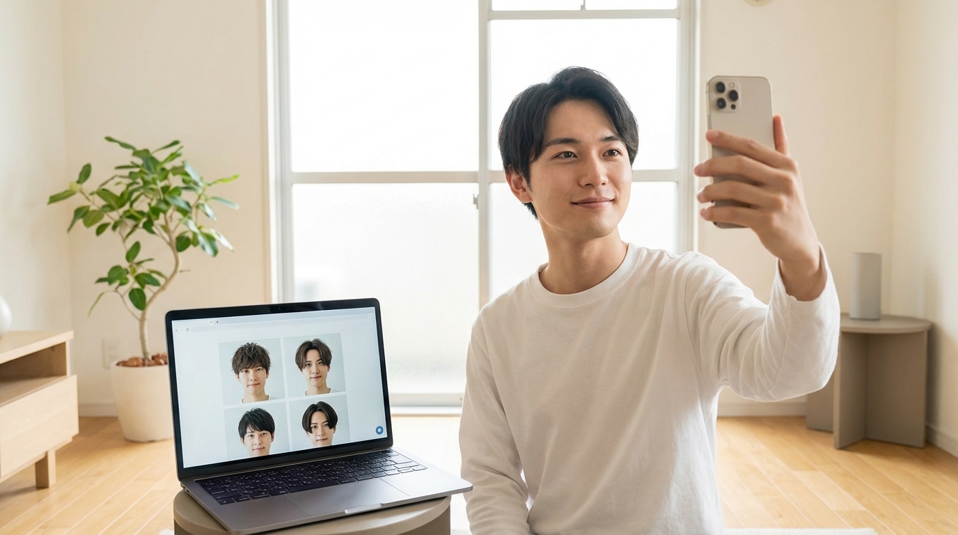 まずは日中の明るい窓際で、真正面から撮影してください。トレンドのスタイルを選択: マッシュやセンターパートなど、今の流行を押さえたスタイルをいくつか当てはめて比較します。全体のバランスと肌馴染みを確認: 髪型だけでなく、顔全体の印象や清潔感がどう変わるかに注目して、自分に最も馴染むものを見極めるのがコツです。