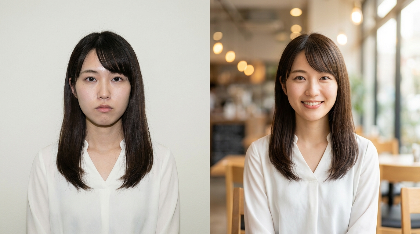 わざわざスタジオに行かなくても、今の時代はAIで解決できます。「AI画像補正なら撮影費用を大幅にカットできる」だけでなく、天候や場所に左右されるストレスもありません。自撮り写真の背景をプロ級のオフィスやカフェに変え、肌質を自然に整えるだけで、数万円かけた写真に匹敵するアイコンが完成します。