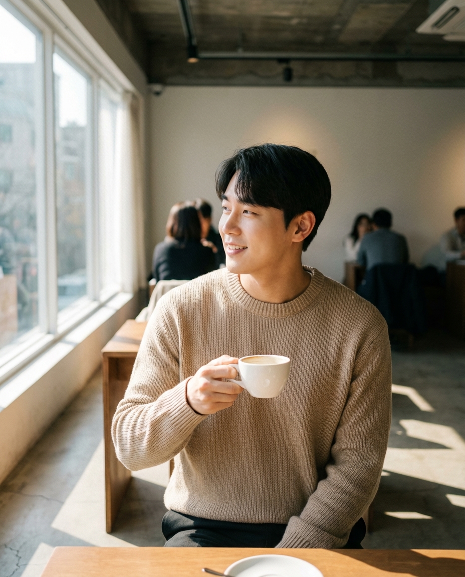 자연광과 캔디드 샷: 창가에서 들어오는 햇빛을 활용하면 인위적인 조명 없이도 화사한 색감을 얻을 수 있습니다. 시선을 살짝 피하는 스타일은 신비로우면서도 세련된 느낌을 줍니다.