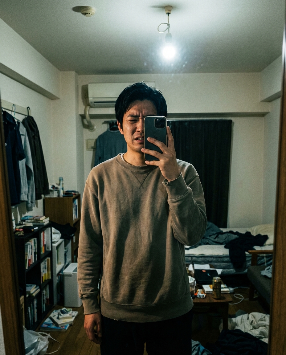 腕を伸ばして撮ると画角が狭くなり、顔が歪んで大きく見えます。また、室内照明のみ:顔に影ができて不潔に見える、カメラを意識しすぎ:表情がガチガチになる、といった失敗が非常に多いです。正直、手持ちの自撮りで『他撮り風』に見せるのは物理的に限界があります。スマホスタンドや三脚がない状態での撮影は、成功率が極めて低いです。