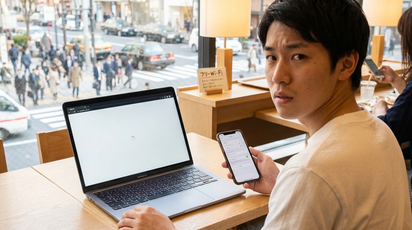 もう一つのシナリオ:外出先で公共Wi-Fiを使ってログインしようとしたら、ページが真っ白になって進まない。これはネットワークの問題が多いので、携帯データに切り替えて再度試すと解決することが多いです。