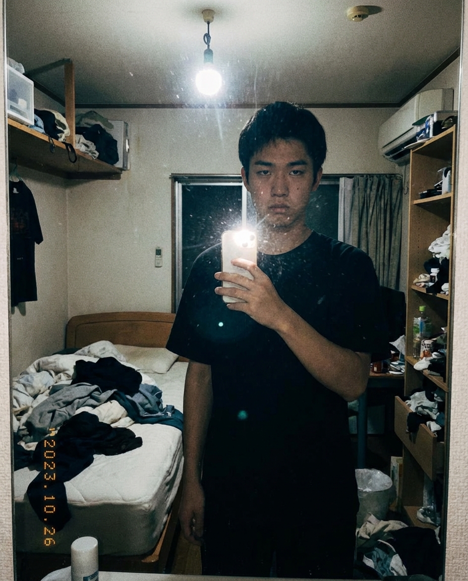 生活感あふれる背景は、清潔感を一瞬で奪います。鏡越し自撮り: 鏡越しは手抜き感が透けて見え、女性から最も不評なパターンの一つです。正直、鏡越しで許されるのは圧倒的なイケメンだけで、一般人がやると『ナルシスト感』だけが際立ち、即座にスワイプされる原因になります。