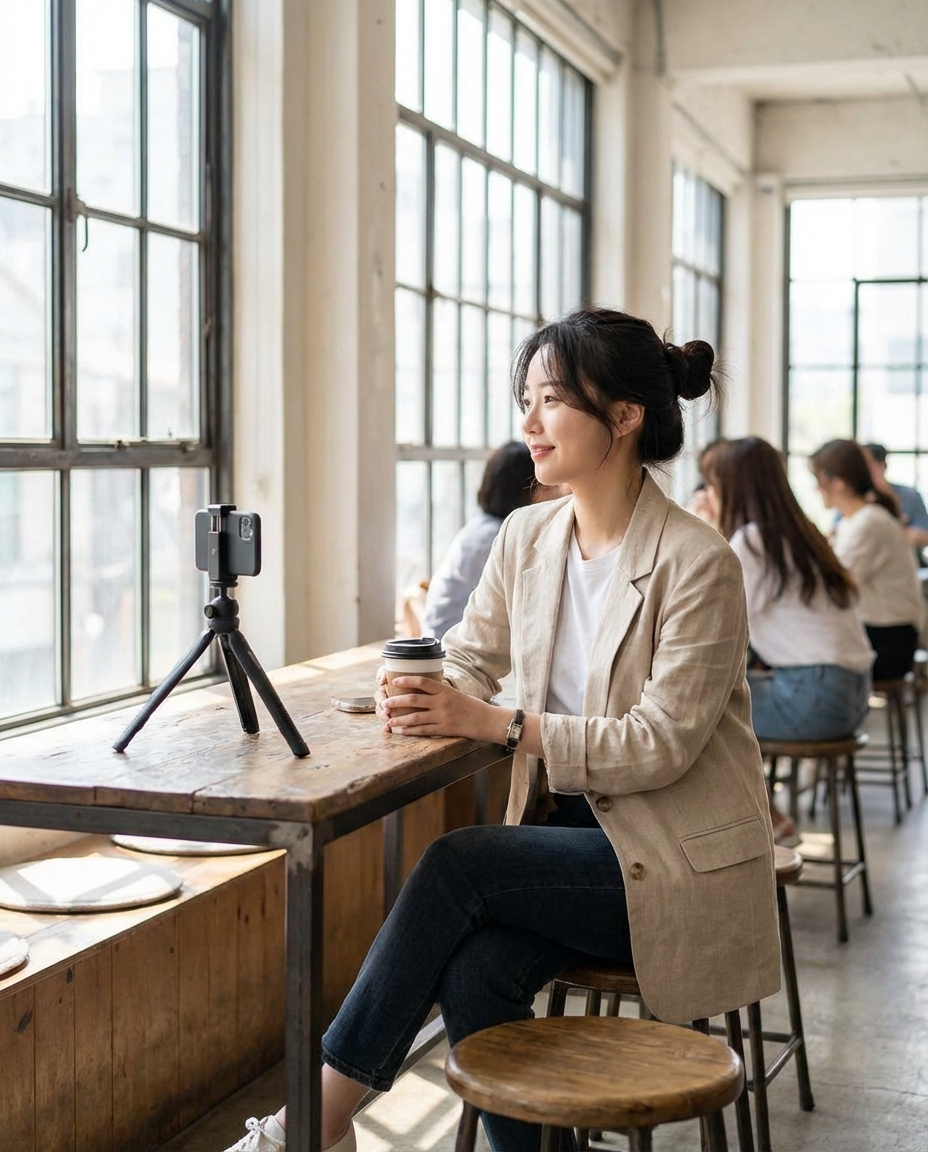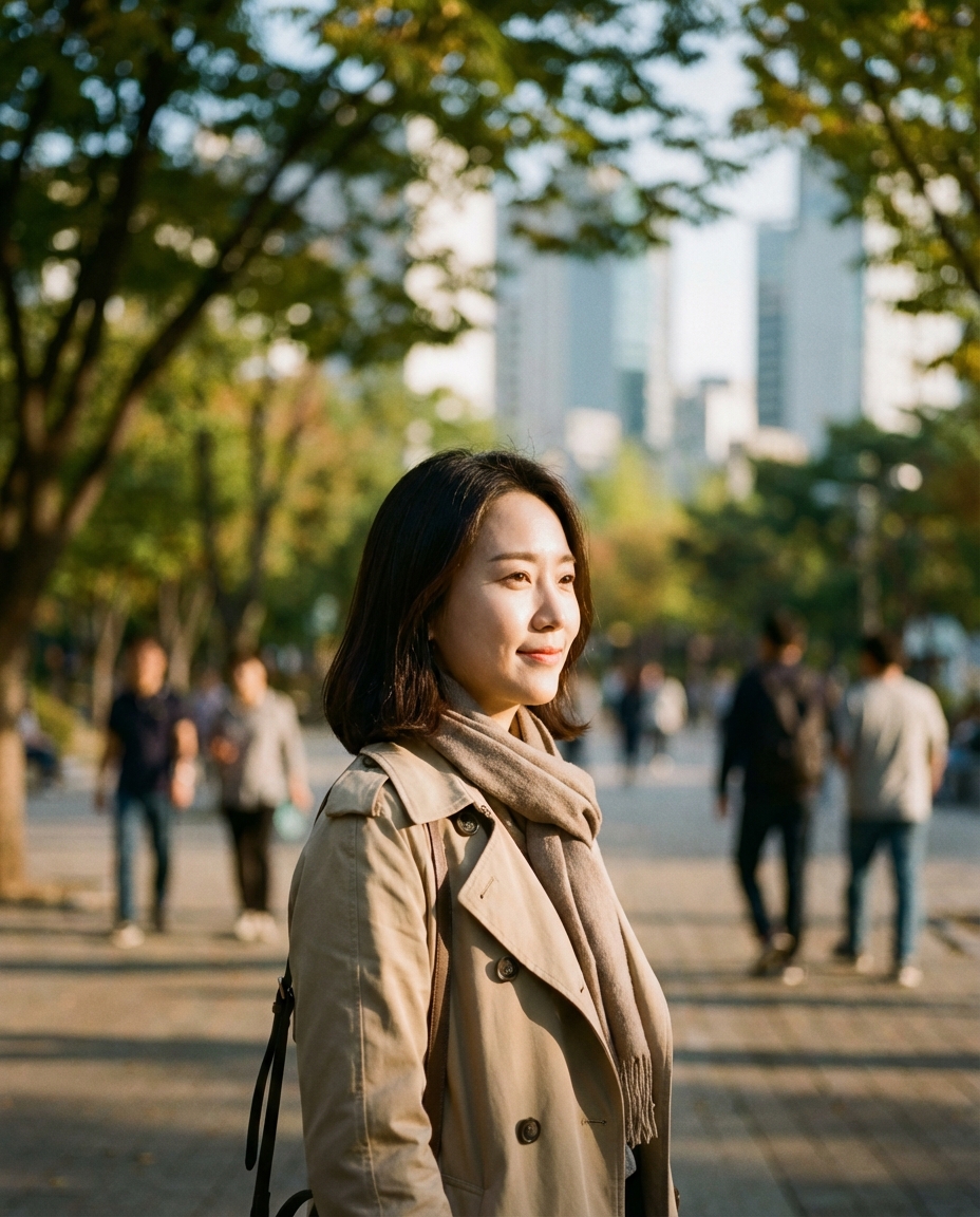카메라 렌즈를 빤히 응시하는 순간 사진은 100% 셀카처럼 보입니다. 시선을 살짝 아래로 내리거나 먼 곳을 바라보는 것만으로도 훨씬 자연스러운 분위기가 연출됩니다. 빛의 방향과 그림자의 활용도 중요합니다. 정면에서 받는 밋밋한 조명보다는 측면에서 들어오는 자연광을 활용해 얼굴에 적당한 음영을 만들어보세요. 평면적인 사진에 입체감이 생기면서 누군가 공들여 찍어준 듯한 깊이감이 생깁니다.