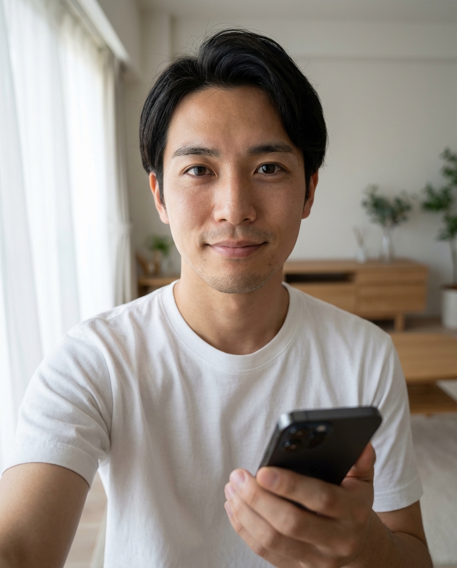 フラッシュを使うと顔が平面的になり、脂浮きも目立ってしまいます。ベストなのは、昼間の窓際で、レースのカーテン越しの柔らかい自然光を使うことです。正面からではなく、斜め前45度くらいから光を受けると、顔に自然な陰影がついて立体感が出ます。これだけで肌の粗も飛び、清潔感が段違いに上がります。